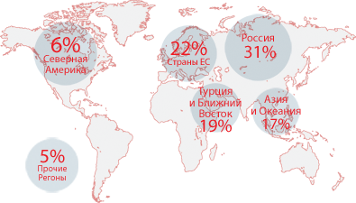 Рисунок 4. Продажи по регионам в 2007 г. (данные на основании физических объемов поставок продукции)