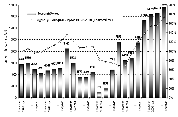 Основные показатели платежного баланса в 2000 году (см. Приложение 1) продолжили свое изменение в направлении, которое было характерно для 1999 года: рост сальдо платежного баланса по текущим операциям с соответствующим увеличением дефицита по счету операций с капиталом и финансовыми инструментами. Величина положительного сальдо по счету текущих операций в течение 2000 года в среднем в 2 раза превышала аналогичные значения для I-III кварталов 1999 года, а в январе 2000 года данный показатель был зафиксирован на уровне, рекордном для российского платежного баланса, – свыше 12 млрд. долл. Вместе с тем основным фактором, определяющим величину сальдо по текущим операциям, являлся торговый баланс, сальдо которого, в свою очередь, в решающей степени определялось движением цен на мировых рынках на нефть и прочие основные товары российского экспорта. Из данных, представленных на рисунке 2.3-1, видно, что связь между мировыми ценами на нефть и сальдо торгового баланса России, наблюдавшаяся в 1995-1999 годах, проявлялась и в течение первых трех кварталов 2000 года [3].