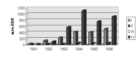 Экспорт в Россию вырос в 1994 году по сравнению с 1993 г. в 1,6 раза(3914,6 млн. ЕЕК), импорт немного больше- в 1,8 раза(3620 млн. ЕЕК). Сальдо баланса внешней торговли с России было положительным (График 3).