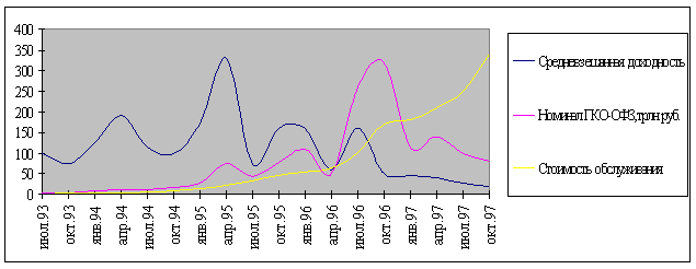 Графики на рисунке 1 демонстрируют также динамику доходности ГКО-ОФЗ и отражают три основных всплеска процентных ставок. Первый был вызван денежной накачкой в 1994г. и последовавшим кризисом валютного рынка.