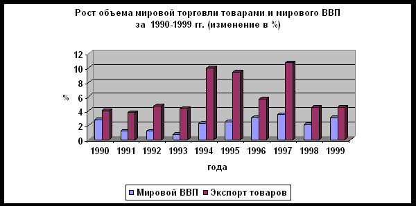 В 90-е годы объем мировой торговли ежегодно увеличивался в среднем почти на 7%, в то время как темпы роста ВВП планеты были в два с лишним раза ниже - примерно 3% в год. Динамика изменения мировой торговли в 99 г. требует отдельного обзора. Во второй половине 99 г. наблюдалось существенное усиление глобального выпуска и торговли, оказавшее позитивное влияние для развивающихся стран, экспорт товаров и услуг которых увеличился в среднем вдвое по сравнению со среднемировым уровнем. В 1999 г. на развивающиеся страны приходилось 27,5% мирового экспорта товаров и 23% экспорта коммерческих услуг.[24] Все это дает перспективы для более высоких темпов роста мировой торговли в будущем, а кто не участвует в борьбе за место под солнцем на глобальном рынке, тот может оказаться на обочине мирового развития.