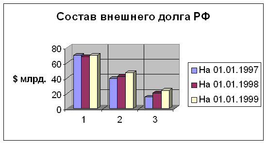 Государственный внешний долг России, согласно проекту бюджета-98, увеличится на 1 января 1999 года до 140,8 млрд. долл. (на 1 января 1997 г. - 125 млрд. долл., 1 января 1998 г. - 130,8 млрд. долл.). В следующей диаграмме отражен состав внешнего долга по видам: 1 – долг иностранным правительствам, 2 – иностранным