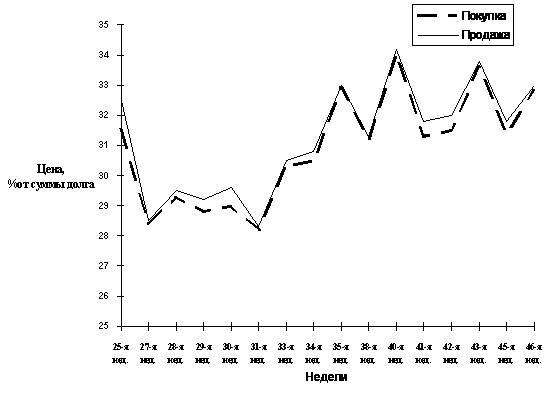 В последние 3 месяца 1995 г. котировки долларовых долгов колебались в интервале 30-34% от суммы долга, причем минимальными они были в период кризиса межбанковских кредитов. Кроме того, необходимо отметить, что в этот период не наблюдалось ярко выраженной тенденции к их росту или падению, а спрэд bid/offer (разница продажа-покупка) стабильно держится на уровне 3/8-1/2 процентных пункта, что показано на графике.