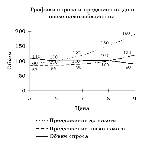 После введения потоварного налога при цене 8 тыс. р. за учебник выручка продавца от реализации одной книги снизится до 6 тыс. р. ( при цене 9 тыс. р. – до 7 тыс. р.). Планируя предложение, продавцу необходимо ориентироваться на объем, соответствующий такой же выручке ( 6 и 7 тыс. р. соответственно), но до введения налога. Таким образом объем предложения после введения налога окажется, при цене 8 тыс. р. – 100 тыс. шт., а при цене 9 тыс. р. – 120 тыс. шт.