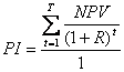 Поскольку прирост конкурентного преимущества обеспечивает (по определению) прирост продуктивности использования ресурсов, который количественно может быть выражен рентабельностью производства, в качестве показателя эффективности может быть принят индекс доходности (PI), который определяется как отношение чистого денежного потока к единовременным инвестициям в проект: