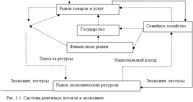 В сводном виде систему денежных потоков в экономике, которая характеризует роль денег в кругообороте продуктов и доходов, можно представить в виде схемы[1] (рис. 1. 1).