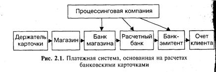 Платежная система состоит из банков — эмитентов карт, банков-эквайреров (владельцев коммерческой сети магазинов и других точек), расчетных банков, процессинговых компаний, пользователей карточек. Держатель карточки получает от мага- зина покупку в кредит. Магазин передает счет в свой банк и получает по нему деньги. Банк магазина получает эту сумму через расчетный банк от банка-эмитента, а последний взыски- вает сумму со счета клиента.