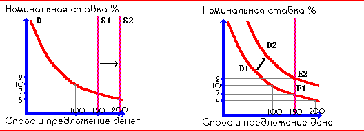 Теперь предположим, что предложение денег увеличилось до 200 миллиардов рублей. Результатом будет падение ставки процента до 5%. При ставке процента, равной 7%, людям потребуется лишь 150 миллиардов. Излишек предложения в 50 миллиардов они инвестируют в ценные бумаги и другие финансовые инструменты. В итоге курсы ценных бумаг будут расти, что эквивалентно падению процентной ставки. Например, по долгосрочной облигации выплачивается процент в 300 рублей в год. Если цена облигации равна 3000 рублей, то норма процента равна 10%. Если цена облигации увеличится до 4000 рублей, то норма процента составит 7,5%. По мере падения процентной ставки цена хранения денег также уменьшается, и население и фирмы увеличивают количество наличности и чековых депозитов. При ставке процента, равной 5%, равновесие на денежном рынке будет восстановлено: спрос и предложение денег будут равны 200 миллиардов рублей. При сокращении предложения денег возникает временный их дефицит. Население пытается преодолеть нехватку денег путем продажи акций и облигаций. Рост предложения на рынке ценных бумаг понизит их рыночную стоимость и одновременно увеличит процентную ставку. Более высокая процентная ставка повышает цену хранения денег и уменьшает их количество, которое люди хотят иметь на руках. Спрос на деньги сокращается, и денежный рынок возвращается к равновесию. Теперь проанализируем ситуацию на втором рисунке. Первоначально рынок находится в равновесии в точке Е1 при номинальной ставке процента в 7%. Рост номинального дохода сдвигает кривую спроса на деньги в положение D2. Положим, что процентная ставка в данное время равна 5%, и соответственной люди хотят держать на руках 200 миллиардов, но банковская система может предложить лишь 150 миллиардов и центральный банк не намерен увеличивать предложение денег. Население и фирмы предпринимают попытки приобрести больше денег, продавая ценные бумаги. Эти действия приводят к понижению цены ценных бумаг и, соответственно, к повышению номинальной ставки процента до 12%, что обеспечивает соответствование количества денег, находящихся в обращении, количеству денег, хранящихся у населения и фирм в соответствии с их желаниями. Денежный рынок достигает нового положения равновесия. Уменьшение спроса на деньги запускает рассмотренные процессы в обратную сторону.