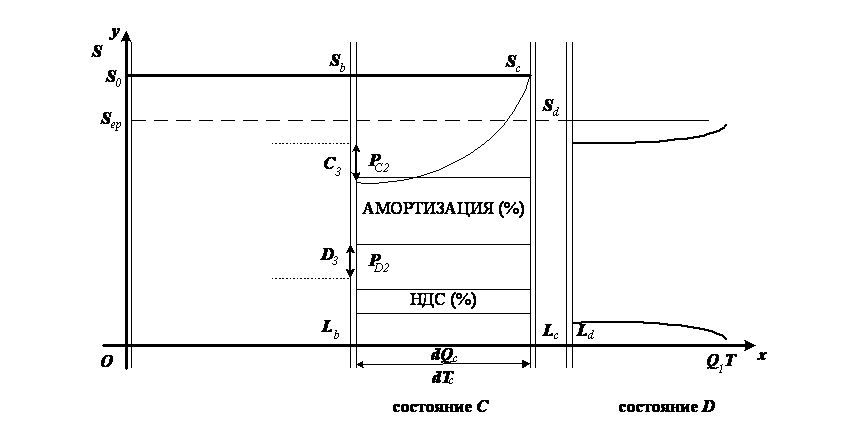 Рассмотрим правую линию прямой SaLa. На этой линии хозяйствующий субъект приступает к осуществлению своей производственной деятельности с новыми производственными экстенсивно расширенными средствами. Так как производственные средства восстанавливались за счет средств накопленной амортизации, а также за счет средств полученной и накопленной прибыли, то хозяйствующий субъект располагает расширенными производственными средствами. Следовательно, в состоянии В возникает действие эффекта масштаба и хозяйствующий субъект получает меньшую величину себестоимости продукции, чем на предыдущем этапе – в состоянии А. Следовательно, хозяйствующий субъект получает возможность на определенную норму увеличить отчисления собственнику при снижении себестоимости. Так как здесь речь идет о нормах, то на модели отражено как бы разделение поровну между хозяйствующим субъектом и его собственником результатов действия эффекта масштаба. В остальном природа состояния В сходна с природой состояния А.