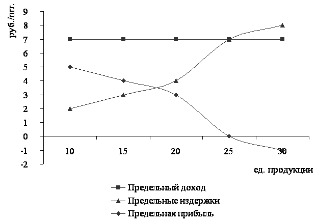 Максимум прибыли определяет точка пересечения линий предельного дохода с предельными издержками. В этой точке предельная прибыль равна нулю. За данными пределами начинаются убытки, которые будут снижать сумму валовой прибыли. Иными словами, максимальную прибыль предприятие может получить при объеме реализации в 25 шкафов в месяц. Если количество реализованной продукции превышает 25 ед., то сумма прибыли уменьшается.