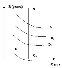 чение спроса на землю, что соответствует сдвигу кривой спроса вверх вправо, приводит к росту рентных платежей. И, наоборот, при снижении спроса на землю рентные вознаграждения сокращаются. Если спрос на землю станет слишком низким (кривая D4), то зерноводческие хозяйства не будут платить ренту вообще[2].
