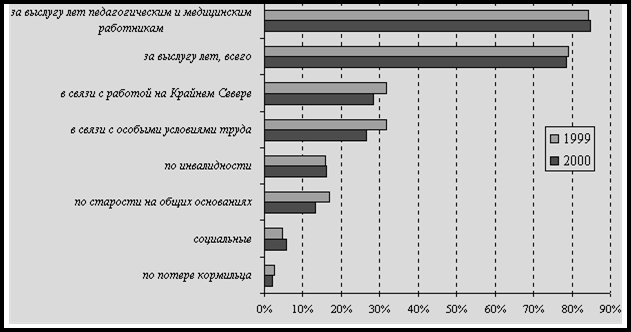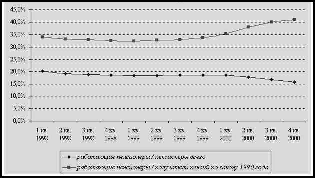 Введение в 1998 году закона, запрещающего получение пенсии в момент работы, привело к снижению доли работающих пенсионеров. В 1998 году, по данным Госкомстата, доля занятых среди пенсионеров по старости сократилась на 5 пунктов и составила 20%. Некоторый, но не очень существенный (рисунок 2), вклад в сокращение занятости внес также августовский кризис, привлекший на определенное время внимание молодых работников к рабочим местам, традиционно занимаемым пожилыми. Особенно заметным влияние закона стало в 2000 году, когда одновременно происходило повышение соотношения заработков, учитываемых при назначении пенсии по Закону 1997 года, и индексация размеров пенсии (рисунок 2).