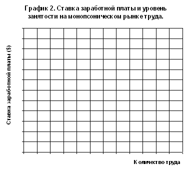 Один рабочий может быть нанят при ставке заработной платы, равной 6 дол. Но найм второго рабочего заставляет фирму платить более высокую заработную плату - 7 дол. Предельные издержки на ресурс (труд) составляют 8 дол. (7 дол., уплачиваемых второму рабочему, плюс повышение ставки для первого рабочего на 1 дол.). Иначе говоря, общие издержки на труд составляют 14 дол. (=2 х 7 дол.), а не 13 дол., при условии, если бы первому рабочему платили 6 дол., а второму- - 7 дол. Значит, Мне второго рабочего равен 8 дол. (=14 дол.-6 дол.), а не 7 дол., как его ставка заработной платы. Аналогичным образом предельные издержки труда третьего рабочего составят 10 дол. (8 дол., которые должны выплачиваться, чтобы привлечь этого рабочего с другого места работы, плюс 2 дол. (= 2х1 дол.) как повышение ставок для первых двух рабочих). Важно, что для монопсониста предельные издержки ресурса (труда) будут превышать ставку заработной платы. Графически это отражается в том, что кривая МRС (колонки 1 и 4 в табл. 2) лежит выше кривой средних издержек труда, или предложения труда (колонки 1 и 2 в табл. 2), что и показано на рисунке 2.