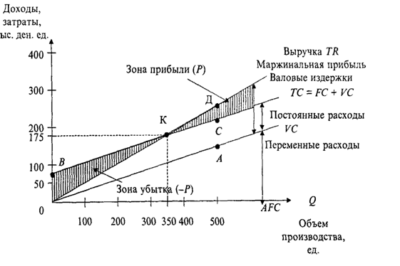 Под критической понимается та точка объема производства, в которой затраты равны выручке от реализации всей продукции, т.е. где нет ни прибыли, ни убытков. Эту точку называют также «мертвой», или точкой безубыточности.