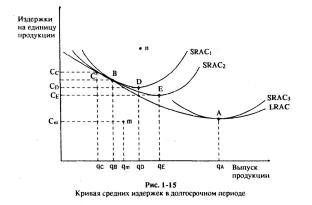 Из рис. 1-15 нетрудно увидеть, что кривая LRAC является огибающей семейства кривых средних издержек фирмы в краткосрочных периодах (SRAC1, SRAC2, SRAC3).[7]