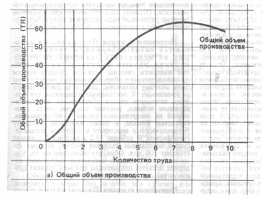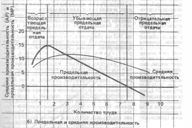 Иначе говоря, предельная производительность измеряет темп изменения общего объема производства, связанного с каждым присоединяющимся рабочим. Поэтому те три фазы, через которые проходит общий объем производства, отражаются и в динамике предельной производительности. Если общий объем производства возрастает с увеличивающейся скоростью, предельная производительность неизбежно растет. На этом этапе добавочные рабочие вносят все больший и больший вклад в общий объем производства. Далее, если объем производства растет. но с убывающей скоростью, предельная производительность имеет положительное значение, но падает. Каждый добавочный рабочий вносит меньший вклад в общий объем производства по сравнению со своим предшественником. Когда общий объем производства достигает максимальной точки, предельная производительность равна нулю. А когда общий объем производства начинает снижаться, предельная производительность приобретает отрицательное значение.