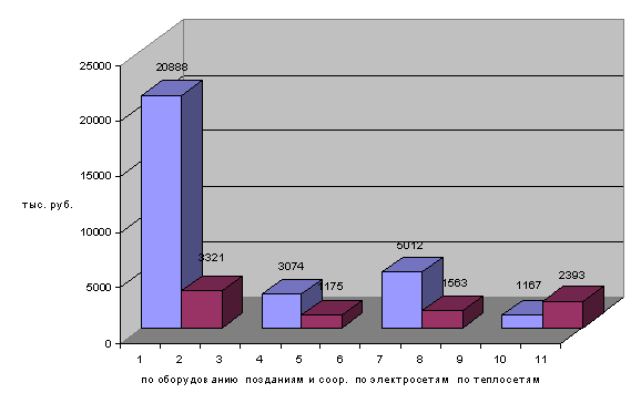 Из графика 2.2. можно увидеть, что ремонтная программа рассчитана на привлечение подрядчиков для ремонта всех основных видов производственных фондов. Затрат на ремонт подрядным способом больше всего приходиться на оборудование (3321 тыс.руб. или 39,3%), практически в 2 раза меньше на ремонт электросетей (1563 тыс. руб. или 18 %) большая часть средств идёт на ремонт подрядным способом теплосетей (2393 тыс. руб. или 28 %), остальная часть средств идёт на ремонт зданий и сооружений (1175 тыс. руб. или 13,9 %). Причём на ремонт теплосетей хозяйственным способом (1167 тыс. руб.) энергосистема по плану должна затратить средств меньше, чем способом подрядным (2393 тыс.руб.).