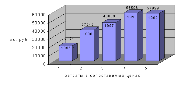 В 1996 году затраты на капитальный ремонт в сопоставимых ценах составили 37645 тыс. рублей, что на 19511 тыс. рублей больше, чем в 1995году. В 1997 году затраты составили 46859 тыс. рублей. Что на 9214 тыс. рублей больше, чем в 1996 голу. В 1998 году затраты на капитальный ремонт составили 58 508 тыс. рублей, что на 11649 тыс. рублей больше, чем в 1997 году. В 1999 году затраты уменьшились по сравнению с 1998 годом на 579 тыс. рублей.