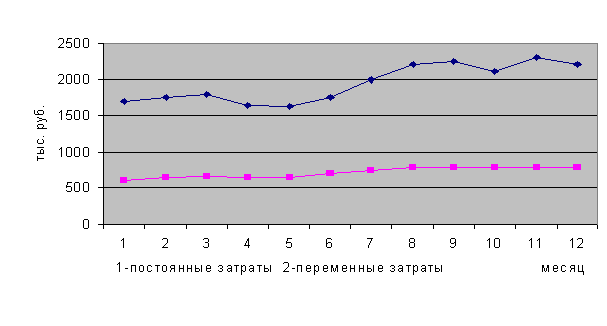 На основе этой таблицы необходимо построить график, на котором будут отражены постоянные и переменные затраты. Провести четкое деление затрат на переменные и постоянные невозможно, так как некоторые из них являются полупостоянными и полупеременными.