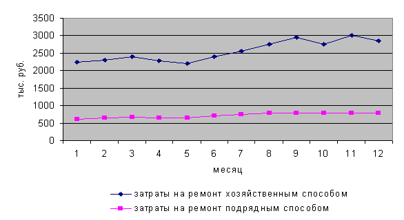 График 2.1. Динамика затрат на ремонт хозяйственным и подрядным способом за 1999 год (по месяцам).
