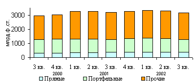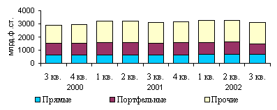По форме вложения средств данный вид инвестиций в 2002 году сложился следующим образом: обычные ценные бумаги - 15,6 млрд.ф.ст., долговые ценные бумаги – минус 18,5 млрд.ф.ст.