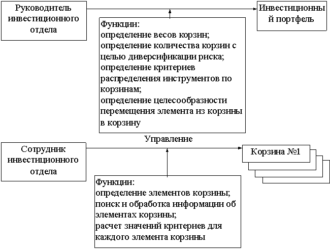 Руководитель группы или инвестиционного отдела выполняет функцию управления составом портфеля: определяет критерии распределения инструментов по корзинам, определяет веса корзин в портфеле, осуществляет координацию действий в случае перераспределения инструментов между корзинами.
