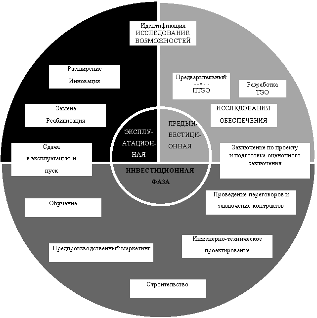Разработка и реализация реального инвестиционного проекта – от первоначальной идеи до эксплуатации предприятия – может быть представлена в виде цикла, состоящего из трех отдельных фаз: предынвестиционной, инвестиционной и эксплуатационной. Каждая из этих фаз, в свою очередь, подразделяется на стадии, и некоторые из них содержат такие важные виды деятельности, как консультирование, проектирование и производство.