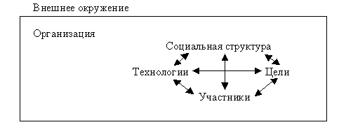Организация состоит из совокупной, слаженной работы внутри организации ее участников, постановки цели, разработки технологического процесса и становления социальной структуры. Описание технологий, целей и участников приведены выше. Приведем ниже описание социальной структуры организации: социальная структура организации разделяется на формальную и неформальную. В формальной структуре социальные позиции и взаимосвязи между ними определены независимо от личностных характеристик членов организации. Взаимосвязи между позициями формальной структуры основаны на правилах, регламентах, положениях и закреплены в официальных документах. Неформальная структура включает взаимосвязи, формируемые на основе личностных характеристик, основанных на отношениях престижа и доверия.