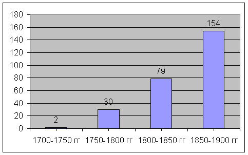 Число лесных пожаров в одном из районов Сибири за два столетия (по Строгому, 1920).