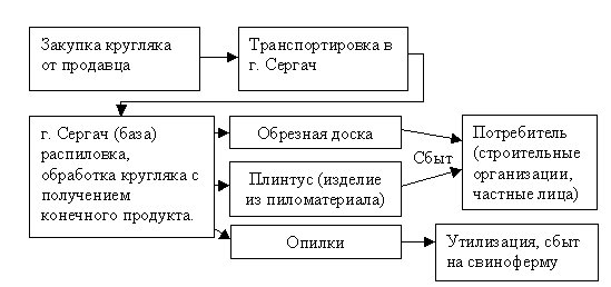 Такова технологическая цепочка работы деревообрабатывающего предприятия в г. Сергаче, основным звеном которой является транспортировка и обработка древесины, так как сбыт по вышеуказанным факторам является второстепенным звеном в технологическом процессе, так же как и закупка.