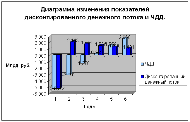 Таким образом, ЧДД при расчете на горизонте T=6 годам равно 2660*106 руб., т.е. больше нуля. На диаграмме показано изменение ЧДД по годам реализации проекта.