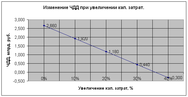 Оценим теперь допустимое увеличение величины капитальных затрат. Результаты расчёта изменения ЧДД при увеличении величины капитальных затрат представлены на рис.