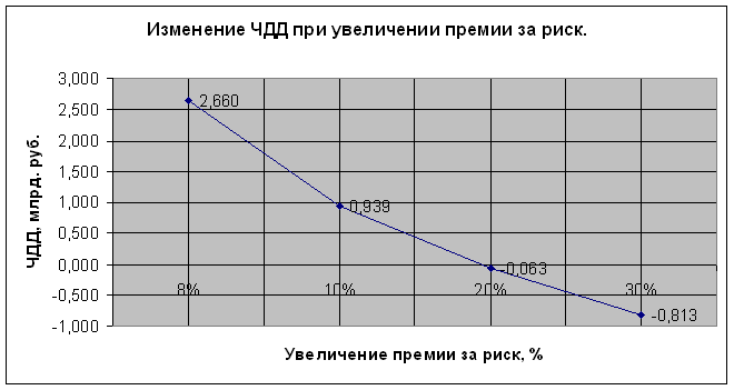Из полученных данных следует, что премия за риск должна быть не более чем 19,55% (ЧДД = 0). Проект можно считать устойчивым к изменению премии за риск, так как при премии за риск= 10% ЧДД =939 млн. руб.