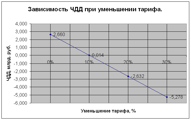 Из полученных данных следует, что уменьшение тарифа не должно быть более чем 10,05% (ЧДД = 0). Проект можно считать устойчивым к изменению тарифа, так как при тарифе =10% ЧДД =14 млн. руб.