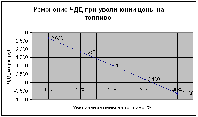 Из полученных данных следует, что цена топлива должна быть увеличена не более чем на 32,45% (ЧДД = 0). Проект можно считать устойчивым к изменению цены на топливо, так как при увеличении цены на топливо на 10% ЧДД =1836 млн. руб.