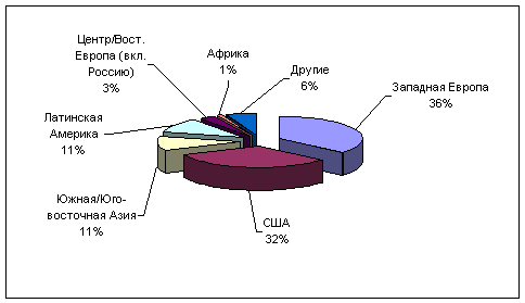 Если рассмотреть долю инвестиций в Россию, как страну относящуюся к Восточной Европе, в глобальном смысле, то мы можем получить наглядное отображение доли регионов-получателей в совокупных прямых иностранных инвестициях по итогам 2000 года[9] (см. рис. 1).