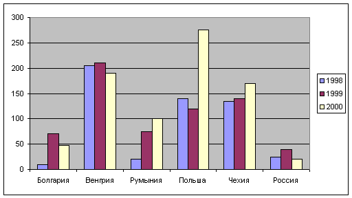 Неутешительным является и сравнение России с бывшими социалистическими государствами Центральной Европы. Уровень прямых иностранных инвестиций в 1998, 1999, 2000 гг. показан на рис. 3[12].