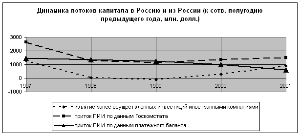 Приток иностранных инвестиций в Россию в первой половине 2001 г., по данным Госкомстата, увеличился до 6,7 млрд. долларов по сравнению с 4,8 млрд. долларов в соответствующем периоде 2000 года. Доля прямых инвестиций оказалась равной 37,5 %, прочие инвестиции составили 58,9 %. Основными отраслями – получателями прямых иностранных инвестиций были: торговля и общественное питание (31,2 %), транспорт (15,1 %), пищевая промышленность (10,8 %), топливная промышленность (7,3 %).
