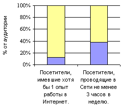 Большинство интернет-пользователей заходят на Web-сайты магазинов в рабочее время. Довольно высок и вечерний уровень посещаемости, но после полуночи он практически равняется нулю. Целевая аудитория виртуальных магазинов чаще имеет доступ в интернет как из дома, так и с работы, в отличие от среднего показателя по Сети. Замечено повышение активности посетителей в послеобеденное время.