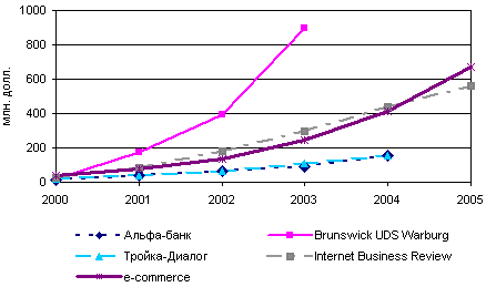 По оценке экспертов, оборот интернет-магазинов в 2000 году составил 50,5 млн. долл. (оценка сделана с учетом оборотов магазина Depo.ru). Оценка потенциальной емкости рынка составляет на конец 2000 года 50 млн. руб. Таким образом, в 2000 году розничный оборот интернет-магазинов составил 40,3 млн., при потенциальной емкости российского рынка 50 млн. долл.