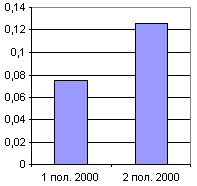 Отношение ядра аудитории интернет-магазинов к ядру аудитории Рунета характеризует степень влияния Web-сайтов виртуальных магазинов на аудиторию русскоязычной Сети. Как видно из Рис.4 за 2 половину 2000 года степень этого влияния возросла на 66%.