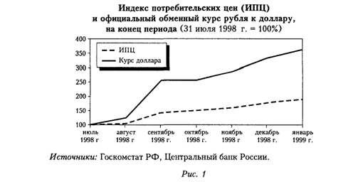 Влияние девальвации на цены в России. Начальная "волна" инфляции была обусловлена прямым воздействием девальвации рубля на цены, а также неуверенностью и пессимистическими ожиданиями, которые привели к увеличению спекулятивного спроса на товары. Обесценивание рубля повлияло на цены импортируемых товаров как прямо, так и косвенно, поскольку цены на некоторые произведенные в России товары тоже повысились. Тем не менее цены возросли не так значительно, как обменный курс, в результате чего покупательная способность доллара в августе-сентябре 1998 г. увеличилась приблизительно на 80% (см. рис. 1).