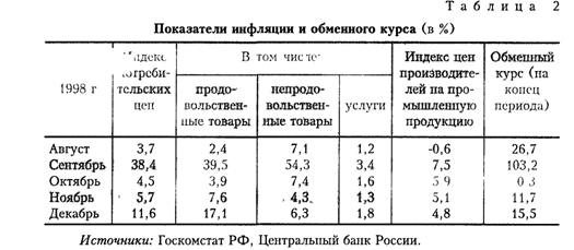 Чтобы понять прямую краткосрочную связь между девальвацией и ценами внутри страны, следует принять во внимание дополнительные факторы: прибыльность импорта и размеры запасов импортируемых товаров до девальвации. Нормы прибыли на импортируемые товары были, как правило, довольно высокими. По данным ЦБР, импортеры могли пережить по меньшей мере 40-процентную девальвацию рубля и при этом совсем не поднимать цены6. В преддверии кризиса пошлины на некоторые категории сельскохозяйственного импорта были снижены на 5-15%. Что же касается запасов импортируемых потребительских товаров, сделанных до 17 августа, то их должно было хватить до конца ноября. За товары, проданные в сентябре, очень редко платили по новому обменному кур-