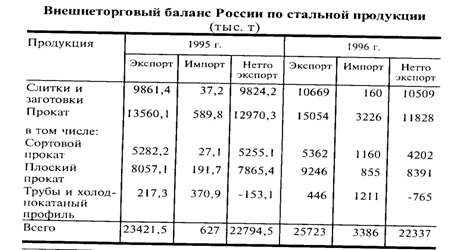 Это безусловно положительный факт, ведь начинали с заготовки. Обращает на себя внимание значительный рост в 1996 г. импорта проката, главным образом, с Украины. Это говорит о том, что ценовая и торговая политика российских производителей и протекционистская политика государства позволяют конкурентам занимать значительные ниши на и без того скудном российском рынке металлопродукции. Импорт продукции в 1996 г. составил 3 млн т с лишним, и в основном это, конечно, украинский прокат. , безусловно, не противники общения с украинскими коллегами, но рынок наш слишком слаб, чтобы можно было без сожаления его уступать.