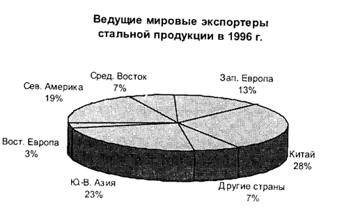 Важнейшими мировыми рынками для экспорта российского стального проката в 1996 г. являлись следующие страны и регионы: Китай — 28%, Северная Америка — 19%, ЮгоВосточная Азия – 23% и страны ЕС – 13%.