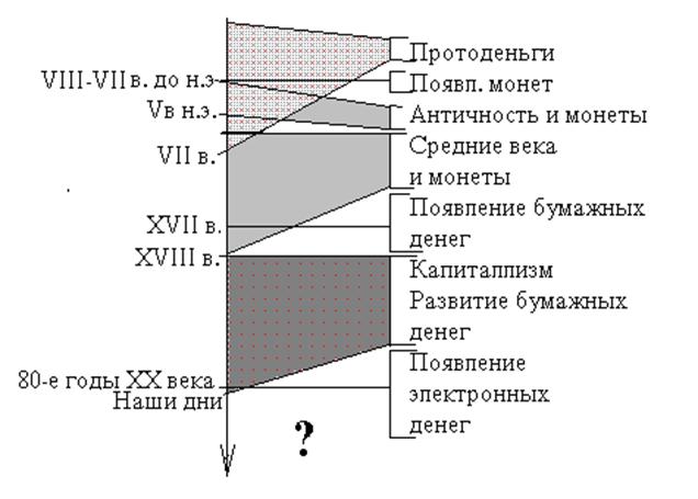 Итак, мы проследили эволюцию денег с древнейших времен до наших дней. Несмотря на обширность материала, всю историю развития денег можно разделить на несколько этапов, представленных на следующей диаграмме.