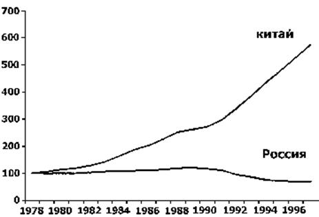Если в 1978 г. китайский ВВП был меньше российского на 23%, то в 1997 г. он уже превышал российский в 6,2 раза. Если в 1978 г. душевое производство ВВП в Китае составляло 11% от российского уровня, то в 1990 г. оно поднялось до 23%, а к 1997 г. достигло уже 75%.
