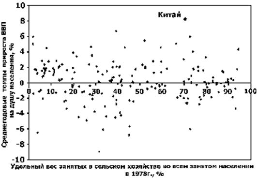График 4 показывает, что темпы экономического роста не зависят от структуры занятого населения. При доле занятых в сельском хозяйстве на уровне, близком к 70,5% (Китай в 1978 г.), значения среднегодовых Темпов экономического роста в разных странах колеблются от -6,0% до +8,2%. Следовательно, структура занятости не объясняет высокие темпы экономического роста в Китае.