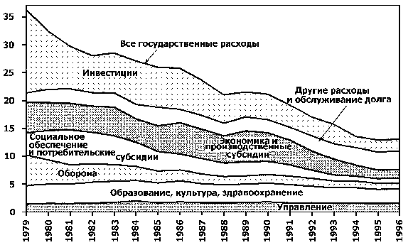 Государственное потребление было уменьшено с 15,2 до 10,6% ВВП. В структуре общих государственных расходов наиболее резко были сокращены расходы центрального правительства (tm) с 20,7% ВВП в 1979 г. до 3,8% ВВП в 1996 г. Снижение расходов на провинциальном уровне было осуществлено в меньших, но, тем не менее, также весьма впечатляющих размерах -- с 15,7 до 8,3% ВВП.