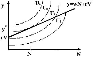 Проекция из точки касания линии бюджетного ограничения одной из кривых безразличия и позволяет определить оптимальный уровень дохода у' и, соответственно, — количество рабочего времени N', необходимого для его достижения.